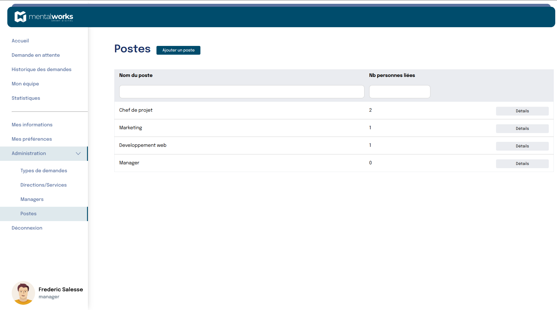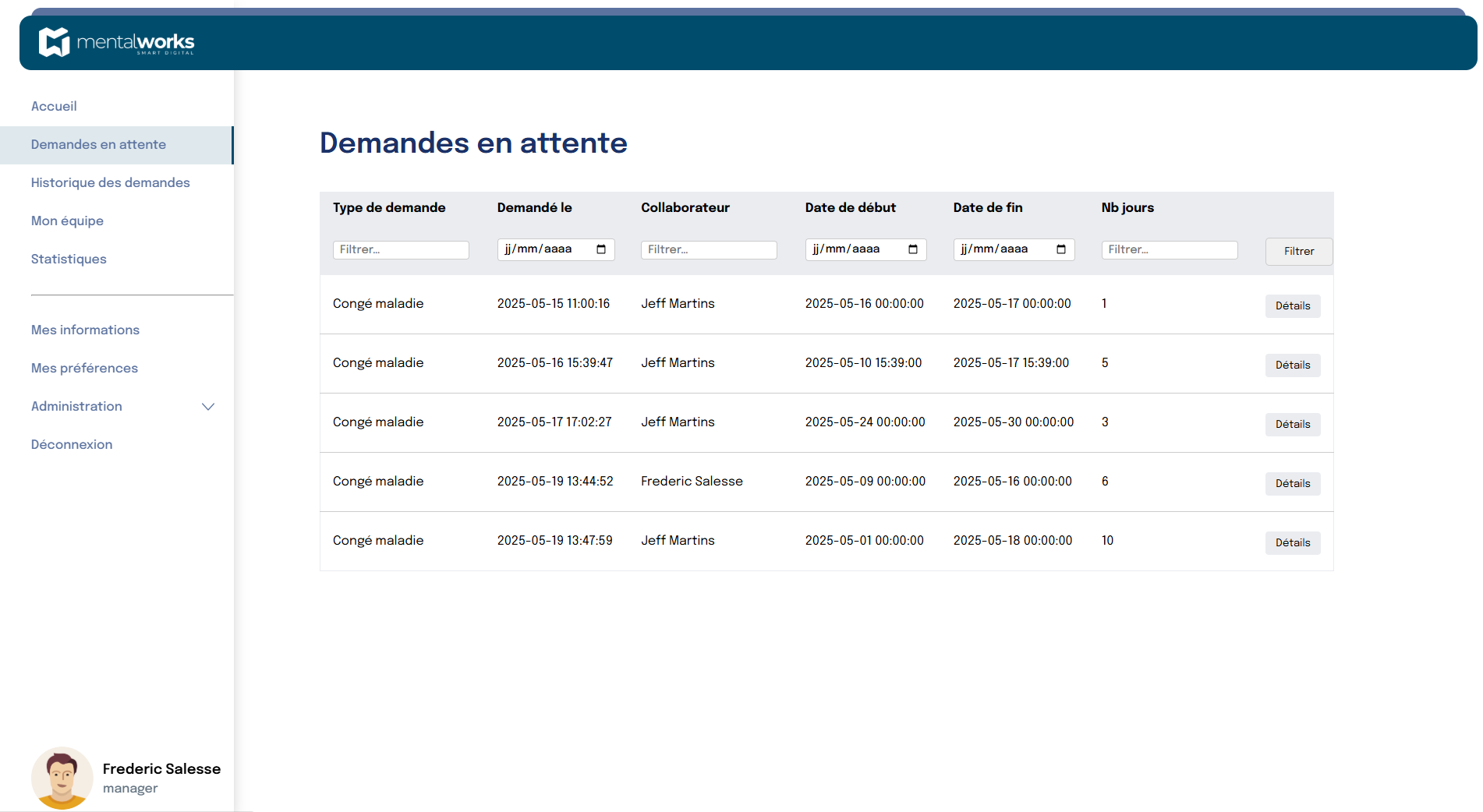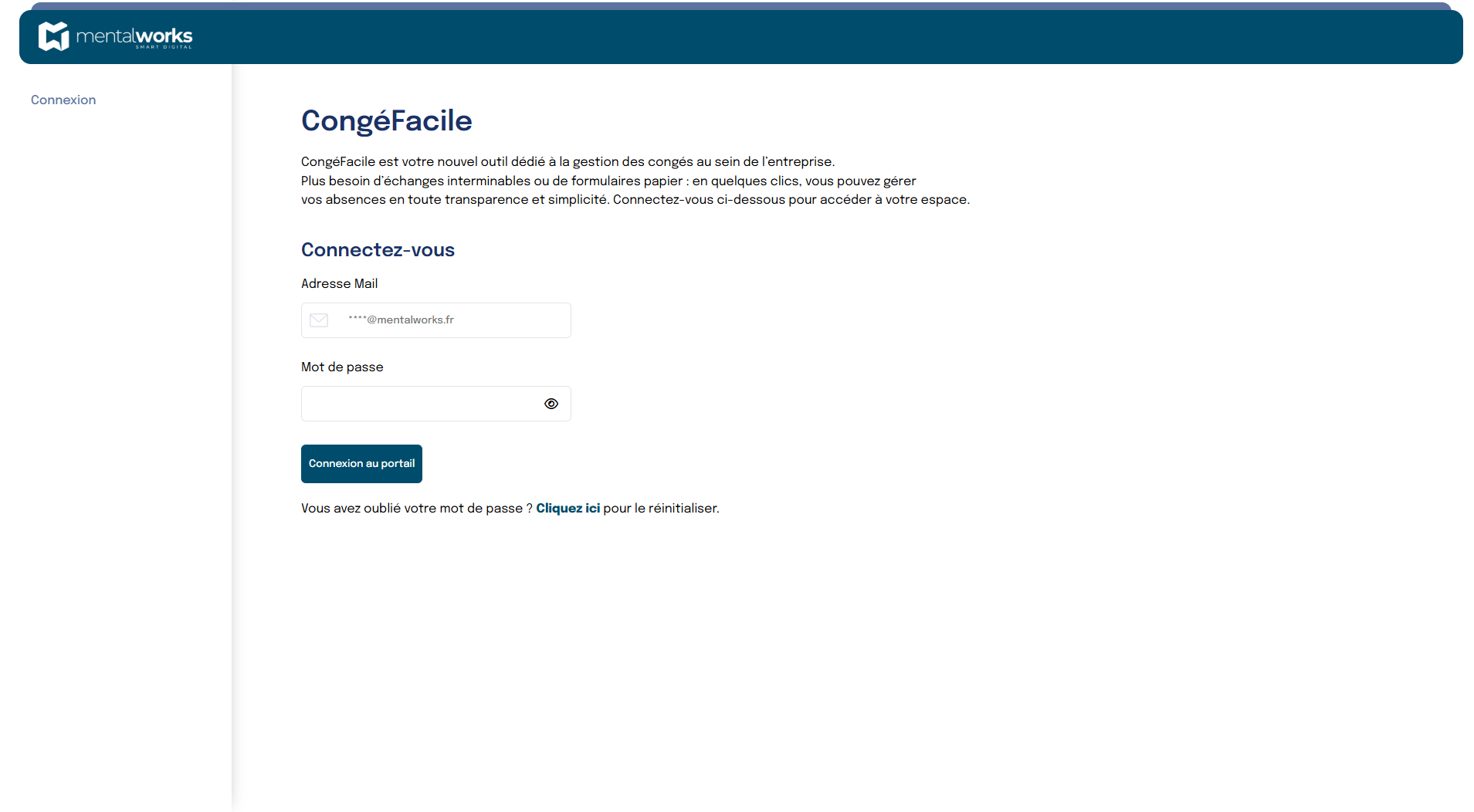 Congé-Facile est le projet de fin d'année du BTS SIO 1re année. Il a été réalisé en groupe de 4 personnes de avril à juin 2025 et consistait à créer une plateforme de demande de congés pour l’entreprise MentalWorks.